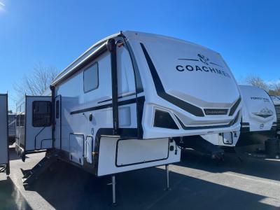 Each Chaparral mid-profile fifth wheel by Coachmen is designed with residential features, loads of storage space, and roomy bedroom suites to make you feel right at home. The durable construction means you can enjoy your RV for years to come. There's 6X double Azdel aluminum cage sidewall system, Weather Shield+ technology, and Tri-Tex powder coated frame technology that will help extend your camping season. Each model includes a Winegard Air 360+ HDTV/radio dome antenna to help keep you connected as you camp, slow rise blackout roller night shades, a new 16 cu. ft. side-by-side stainless glass 12V refrigerator, and a modern electric fireplace to make your space cozy. There is also a large transom window in the kitchen, a modern high-rise faucet, LED motion sensor lights in the bathroom, plus a full-size shower with glass doors and a seat. Now that's what I call luxury! Choose a Chaparral fifth wheel today!