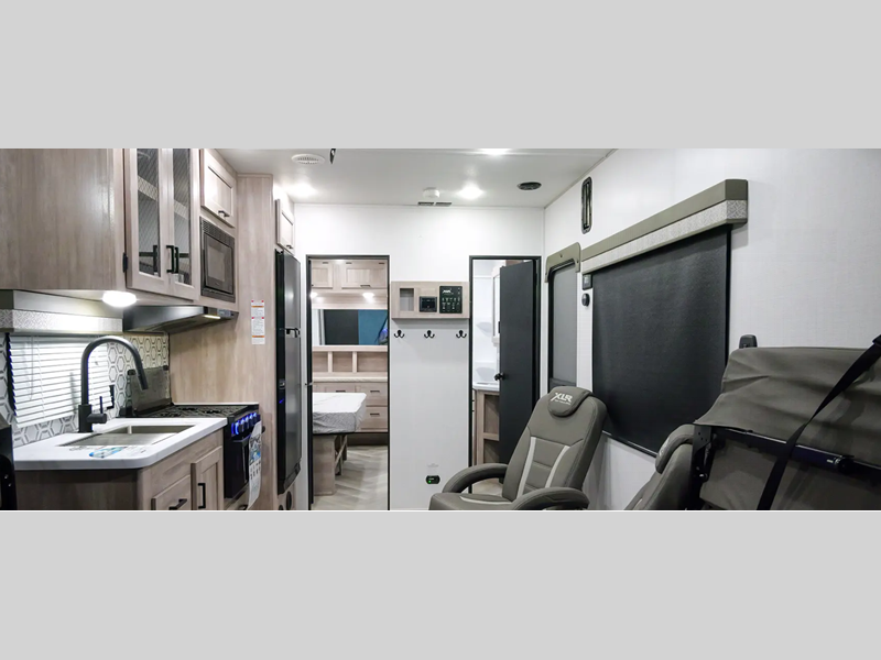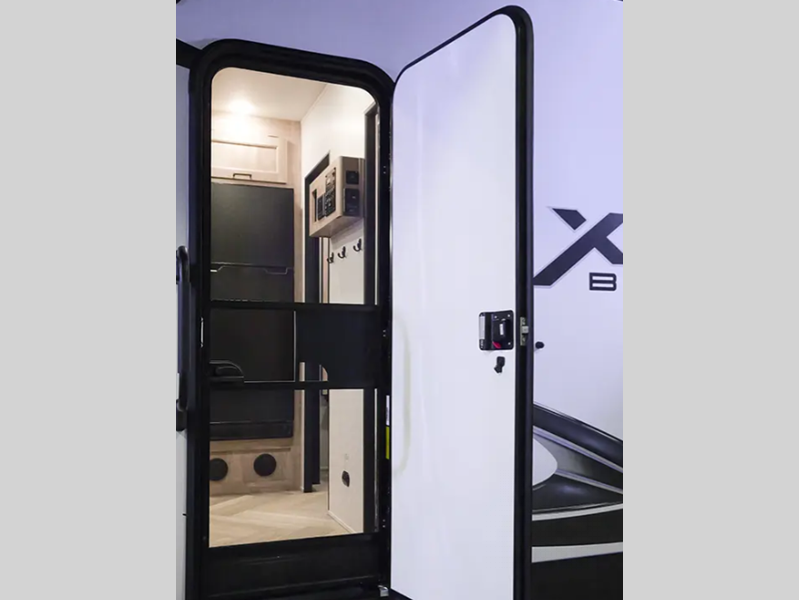 There is fiberglass flooring insulation that will withstand your many adventures plus a rear beaver tail frame for easy unloading and an external fuel cell with a pump. You will feel right at home with decorative glass cabinet doors and LED lights, and there is a tankless water heater to provide endless hot showers after trail riding. The Alumifoil insulated enclosed underbelly will help extend your camping season, and each model is back up camera ready if you want to make parking easier than ever.