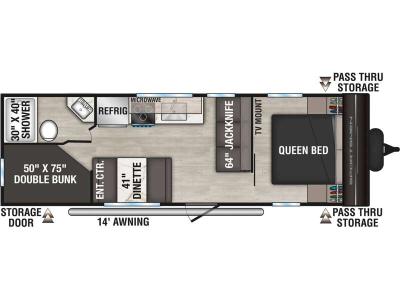 This travel trailer can comfortably sleep eight between the double-size bunks, the queen bed in the front bedroom, plus the booth dinette and jackknife sofa in the main living area. Everyone can freshen up each day in the full bath that includes a shower pan, foot flush toilet, and a sink. The chef of your group can make dinner on the cooktop or in the microwave oven, and there is a 10-cu. ft. 12V refrigerator for perishables. This model also includes a TV mount if you want to add a television for movie nights, and there is an exterior pass-through storage for fishing poles, camp chairs, and more!